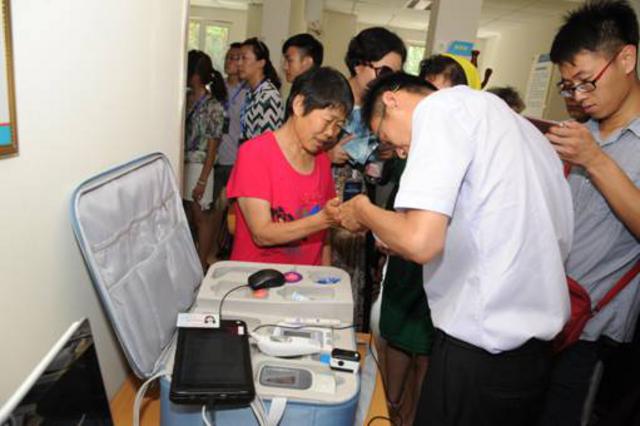 日间照料中心的工作人员正在为社区内的老人检查身体
