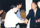 江泽民主席接见全国大学生"在成才道路上"报告团时与原武汉水利电力学院女博士生袁宇立亲切握手 |